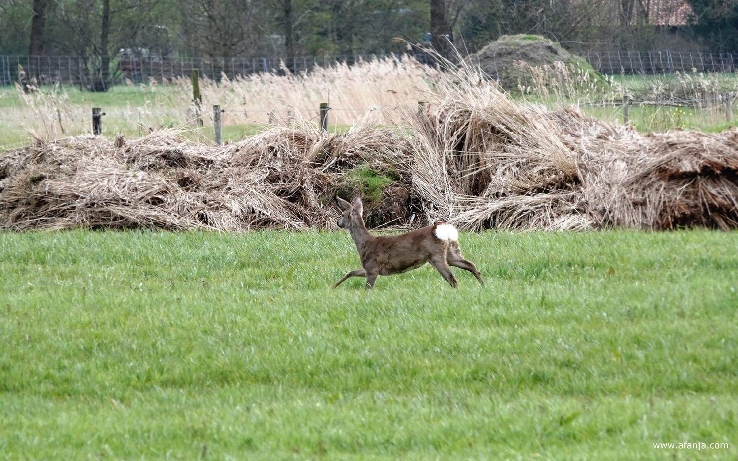 Ter hoogte van de Legauke zette ik de auto even half in de berm om een tegemoetkomende vrachtwagen te laten passeren. Aan de overkant van de weg zag ik meteen een ree lopen. De camera was snel gepakt, en dat was maar goed ook, want enkele tellen later kwam er in volle galop een reebok achteraan …