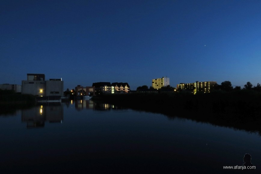 De rust straalt er vanaf. Mooi zo met de lichtjes en de silhouetten van de gebouwen erbij.