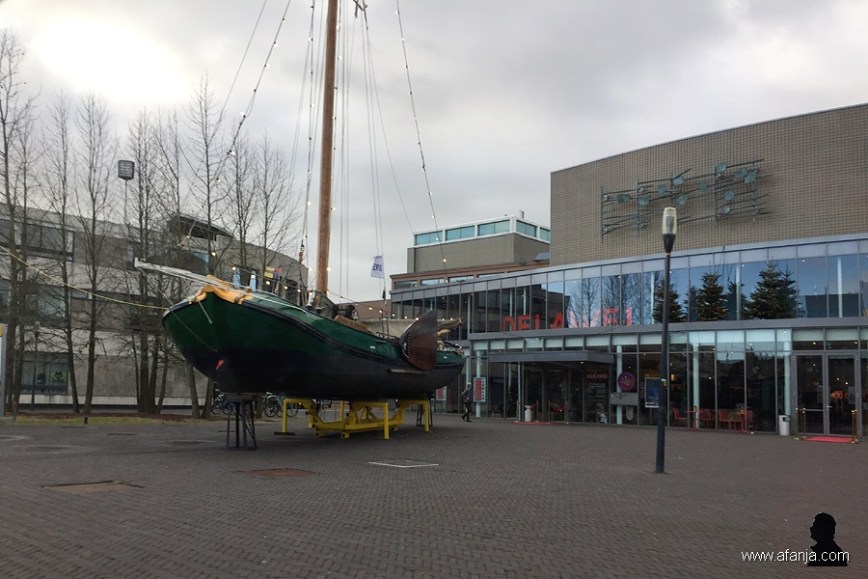 Op het plein voor schouwburg De Lawei ligt het skûtsje “Doeke van Martena”, een Friese platbodem die in 1906 is gebouwd op de bekende scheepswerf Buitenstvallaat bij Drachten …