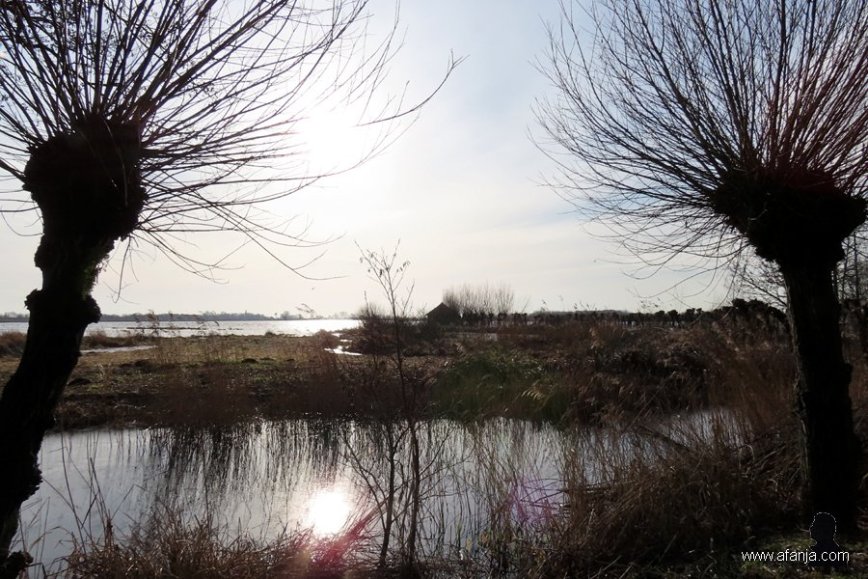 De Jan Durkspolder biedt met wat zon een heel andere aanblik dan laatst met sneeuw en ijs. Het met pas geknotte wilgen omgeven betonnen pad naar de grote vogelkijkhut ligt er glinsterend bij …