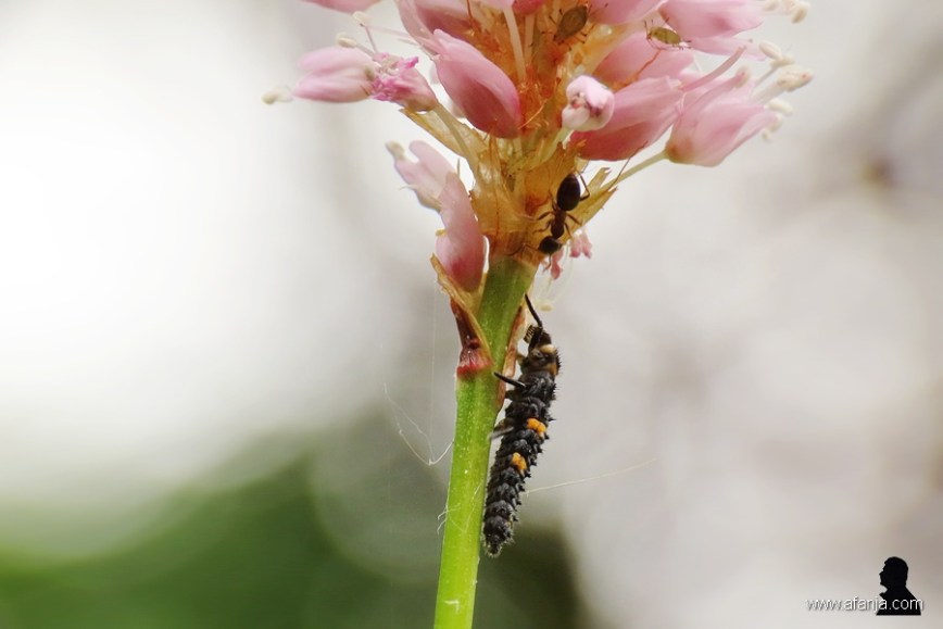 Maar ook minder opvallend was het er vaak een drukte van belang. Op de onderstaande foto van boven naar beneden bladluizen, een mier en de larve van een lieveheersbeestje. Dat treffen zal niet voor alle deelnemers even goed zijn afgelopen, vermoed ik …