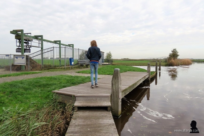 Wat zou het mooi zijn om de deelnemers aan een volgende Elfstedentocht hier nog eens onder door te zien gaan. Maar de klimaatopwarming maakt die kans er helaas niet groter op. Te voet viel het ook al niet mee om eronder door te gaan, een deel van het vlonderpad was verdwenen. Nadat ik had verteld dat de andere kant van de brug in afwachting van de volgende tocht nog leeg was, liet Tijmen zich niet door de verdwenen planken weerhouden om even te kijken of dat nou wel echt zo was …