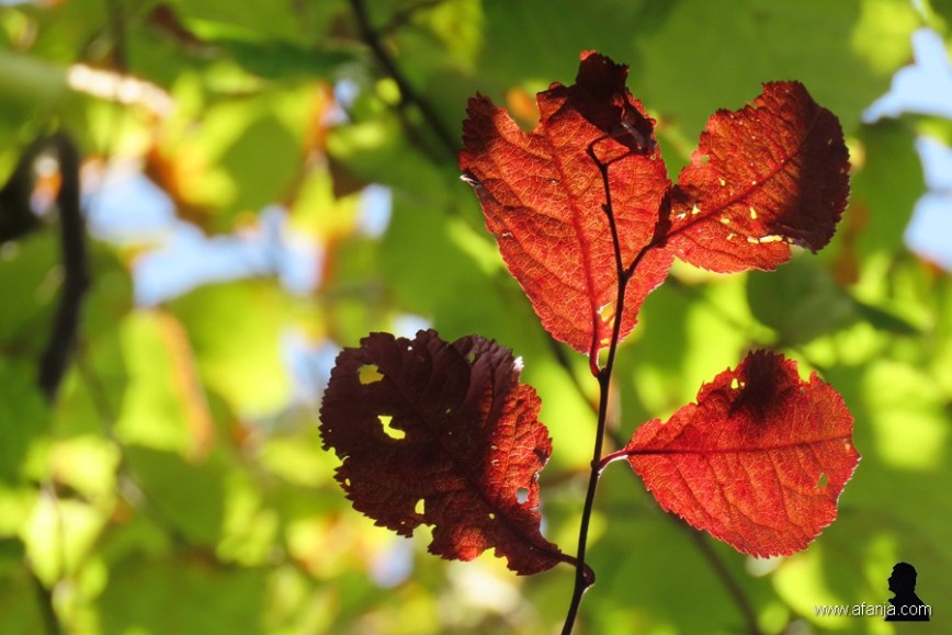 Nog eenmaal richt ik de blik omhoog naar de kleurige herfsttooi die daar onder een strakblauwe lucht hangt …