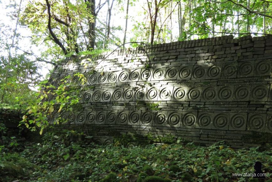 We laten het slootje en de verzwakte kademuur achter ons en gaan verder de Ecokathedraal in. Al snel passeren we de grote tegelmuur met zijn vaak zo mooie schaduwwerking als het zonlicht er overheen strijkt …