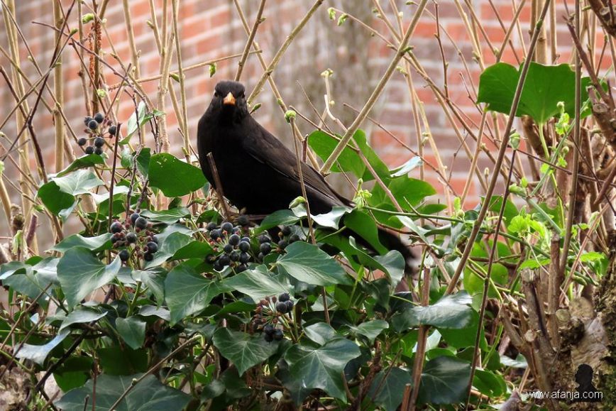 Het zou wel eens kunnen dat er weer een merelkoppel in de klimop nestelt. Het is alleen ontzettend moeilijk om uit te vinden waar het nest dan zit, want het zijn bazen in misleiding van hun route door die klimop. 🙂