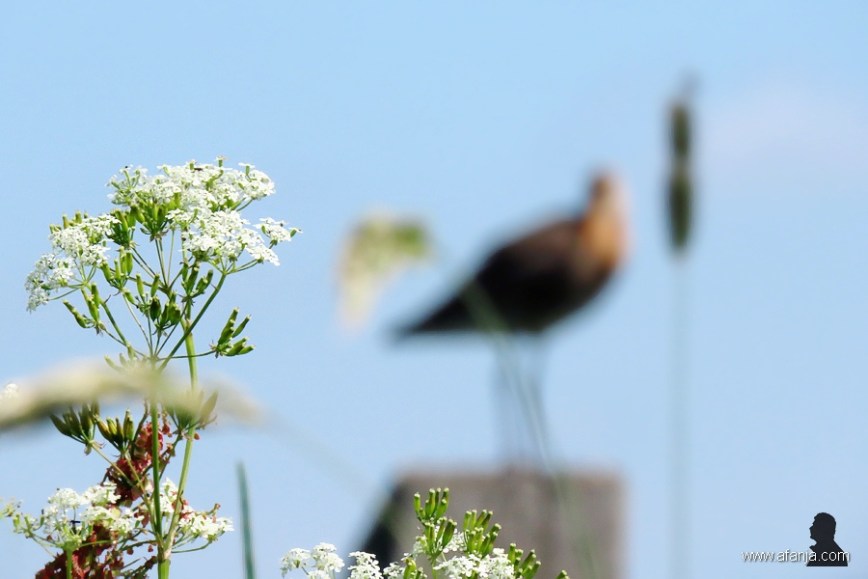 Hij hield me wel goed in de gaten, dat was duidelijk. Omdat ik toch al aan de rechterkant van de weg in de berm liep, ben ik daar achter de eerste de beste bos fluitenkruid gekropen. En zo kreeg ik de kans om nu eens een grutto in een bloemrijke omlijsting vast te kunnen leggen …