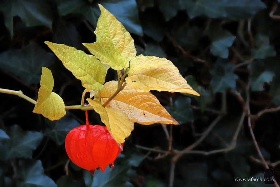 Ik sluit af met toch wel een typisch herfstbeeld: fel oranje lampionnetjes die het onder een dun, intussen geel bladerdek, droog proberen te houden. Kijkend naar de druppels die onder de lampionnetjes hangen, is dat niet helemaal gelukt …