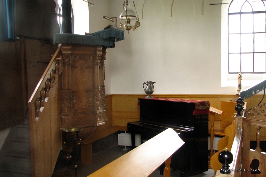 Een blik door één van de ramen aan de noordzijde op een klein deel van het interieur, de preekstoel uit de eerste helft van de zeventiende eeuw. De kanselbijbel dateert uit 1643 …