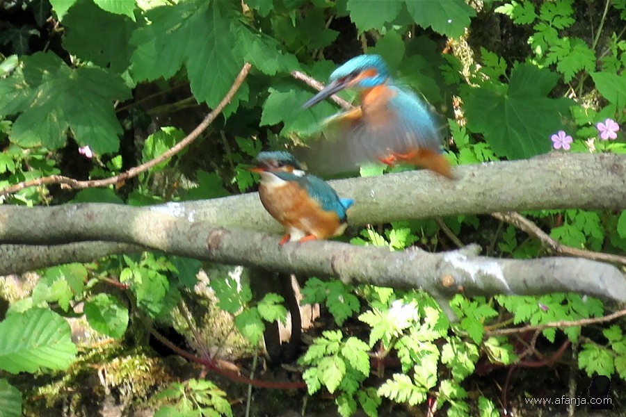Dinsdag 17 mei verscheen mevrouw ijsvogel tegen elf uur ’s ochtends op haar vaste plekje bij het nest. Niet veel later ging meneer ijsvogel op het uiteinde van de tak bij haar zitten. Terwijl ze hun kopjes enkele keren heen en weer draaiden, werden blikken gemeden en gewisseld …