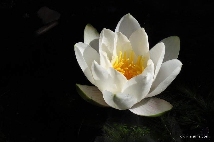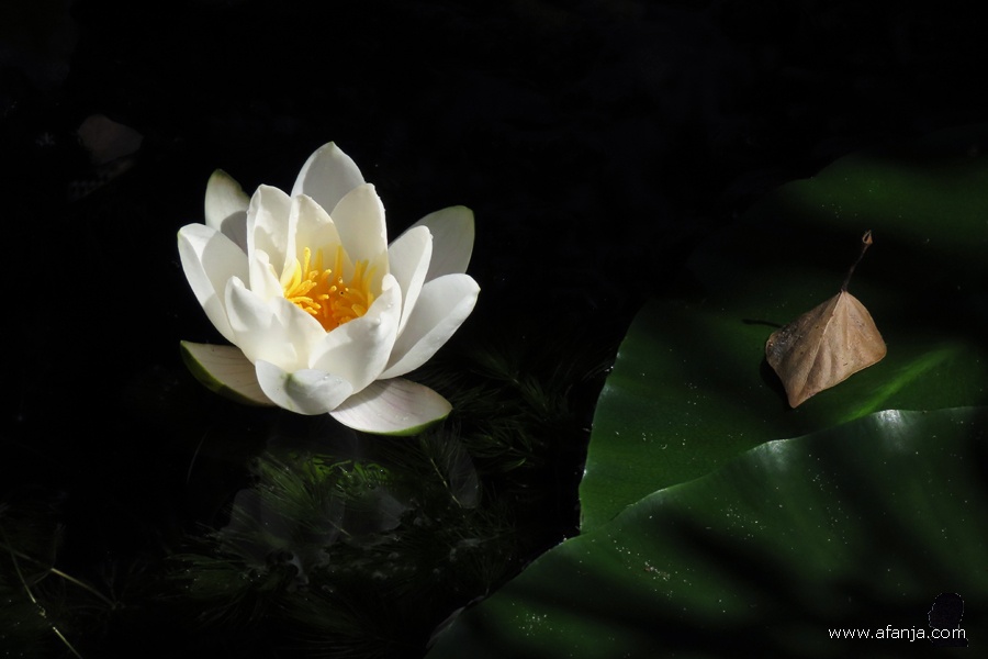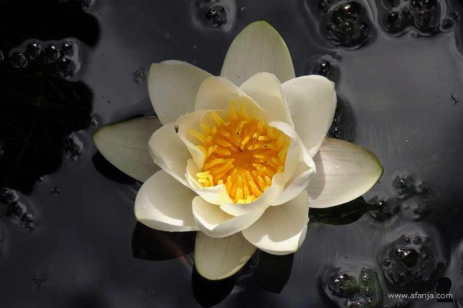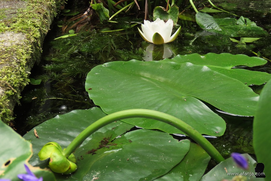Toen die enkele dagen later zijn kop boog om opnieuw onder te duiken, was de eerste waterlelie net open gegaan. Intussen staan er twee waterlelies in bloei …