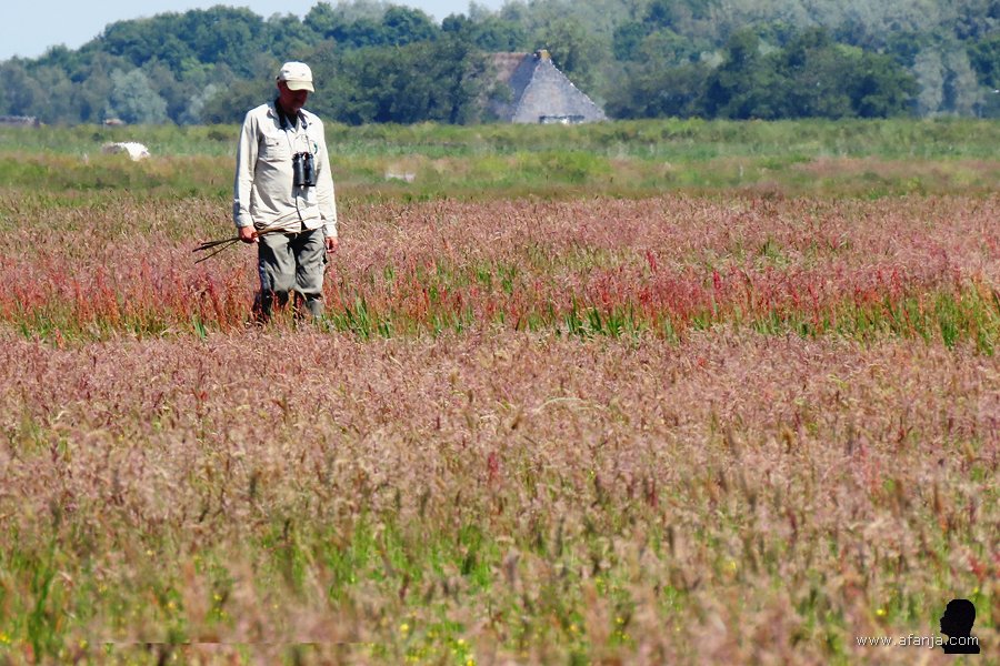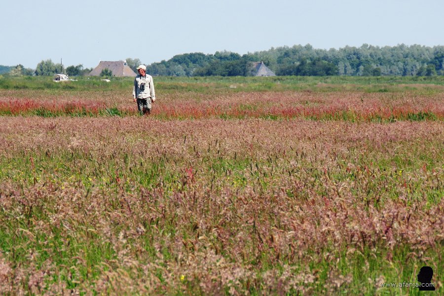 In de verte zag ik iemand met een verrekijker lopen. Toen ik hem even later beter in beeld kreeg, zag ik dat hij een aantal stokken in zijn hand had. Dat maakte meteen duidelijk dat het de zogenaamde nazorger van het gebied is. Met de stokken heeft hij de nesten in het land gemarkeerd om ze te beschermen tegen de noodzakelijke werkzaamheden van de boer. Ze zoeken en markeren nesten, en ze tellen en registreren aantallen vogels, eieren en kuikens …