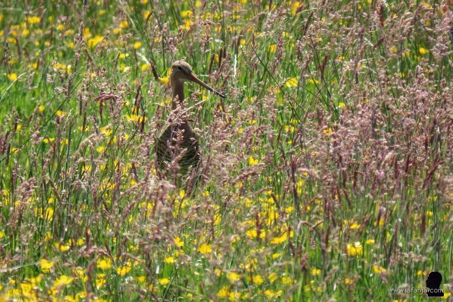 Als de nazorger het weiland heeft verlaten en als ook de fotograaf geen bedreiging blijkt te zijn, is de alarmfase voorbij en strijken de grutto’s weer neer op hun uitkijkpost op een paal of ergens tussen grassen, bloemen en zuring …