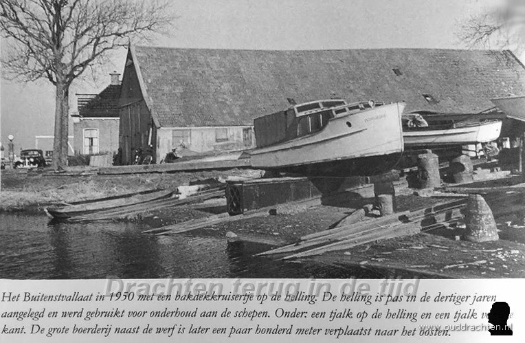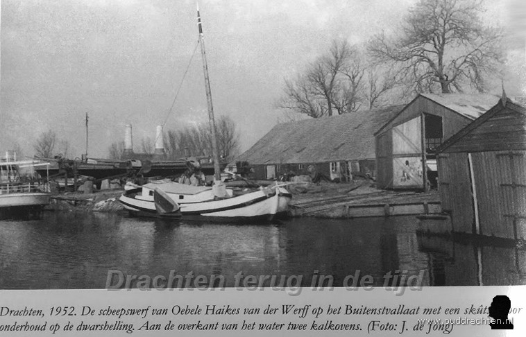 Ik sluit deze blogserie over Buitenstvallaat af met een fotoserie die ik heb geleend van de site ‘Drachten terug in de tijd‘. De foto’s dateren van ca. 1920 tot 1980. Je zult zien, dat er in 100 jaar maar weinig is veranderd in de buurtschap. Er is echter één beeldbepalend landschapselement verdwenen: ongeveer 150 m ten noorden van de scheepswerf stonden tot in de jaren ’70 twee kalkovens …