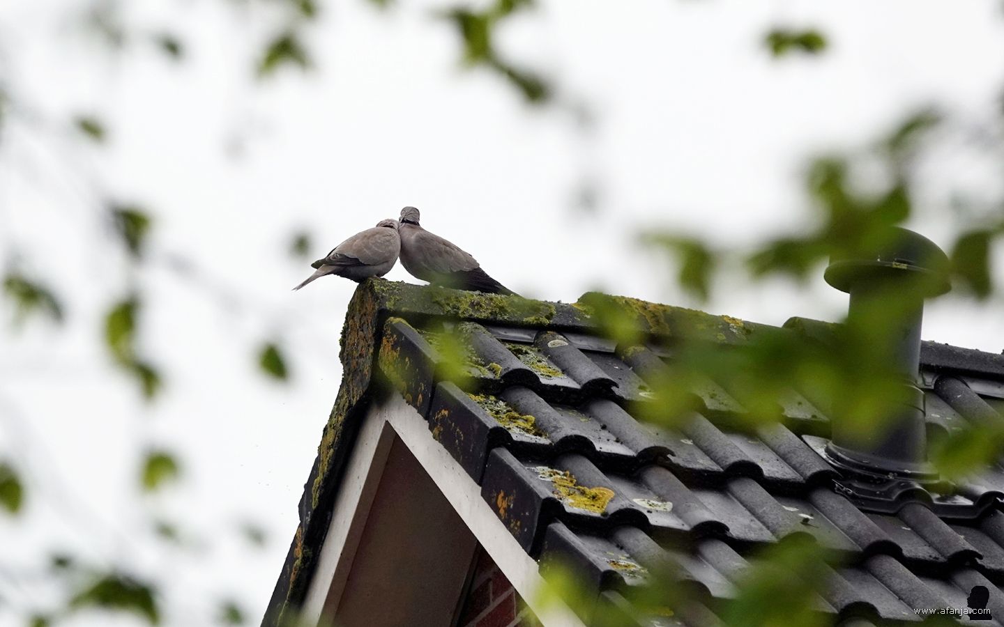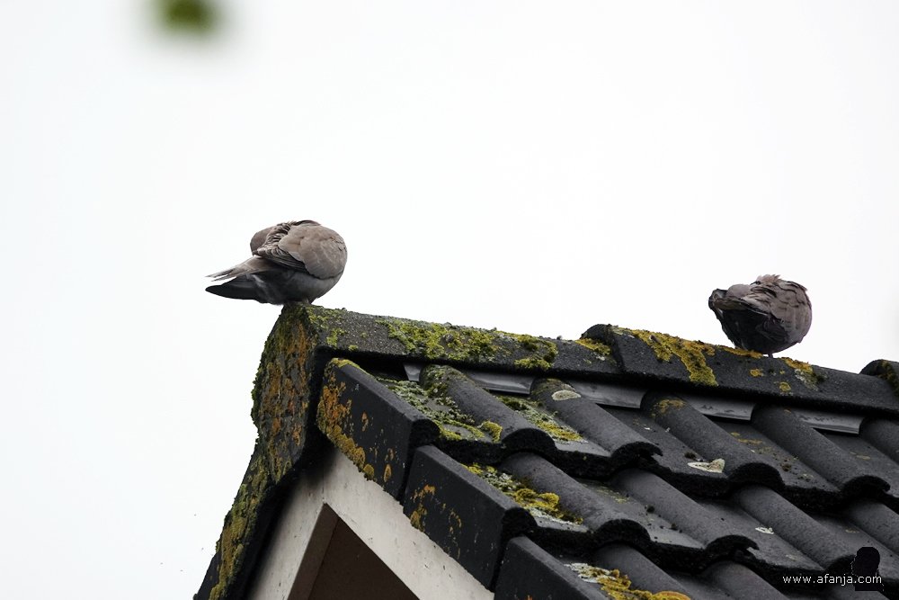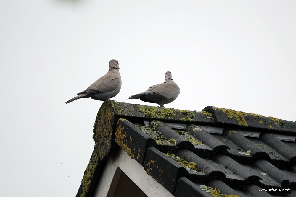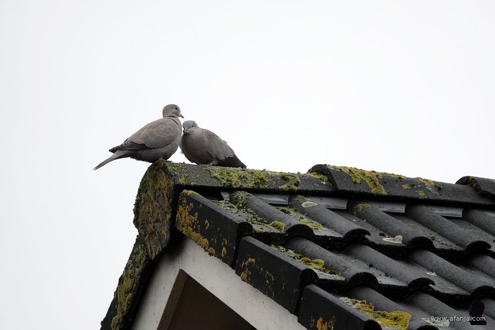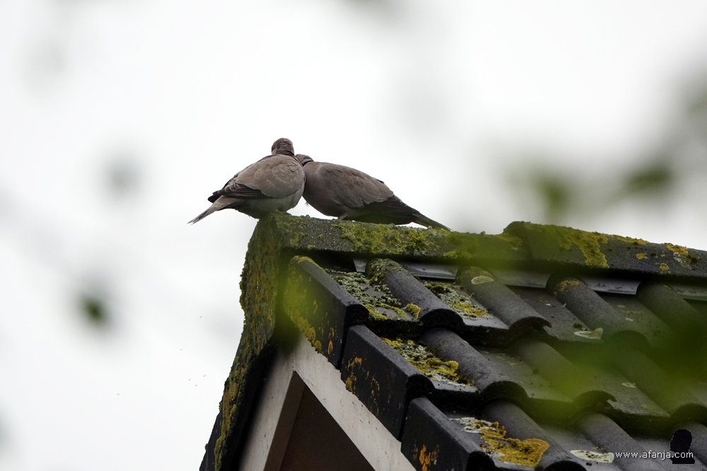 Vorige week had ik een paar dansende houtduiven voor de camera. Toen ik gisteren tussen de buien door even de tuin inliep, zaten er een paar tortelduifjes op het dak te tortelen …