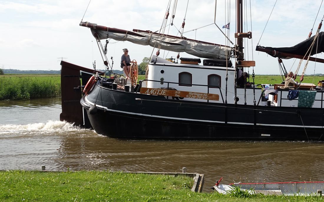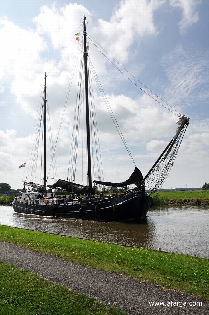 Deze mooie tweemaster zag ik voorbij varen in de Dokkumer Ee, toen Aafje en ik een dag te gast waren bij mijn fotomaatje en haar eega, die vakantie vierden op een SVR-camping aan het water. Het was een mooi plekje waar genoeg te zien en te fotograferen was …