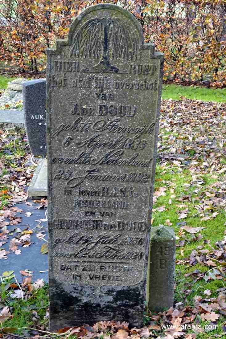 “Daar ligt die en die …, en dat graf daar is van hem en haar …” De man had bij ieder graf wel een verhaal en verschillende keren kwamen we langs bekenden en verre familieleden van mijn fotomaatje. Terwijl ik tussendoor wat plaatjes schoot van grafornamenten, hoorde ik onze gids zeggen: “En hier ligt een van onze meest vermaarde oud-inwoners, meester De Dood. Meester De Dood was de laatste onderwijzer van de school in het naburige Nederland. Na zijn dood in 1892 werd het schooltje verplaatst naar een buurdorp. “Maar,” zo zei de beheerder met een knipoog: “Er wordt gefluisterd dat De Dood hier op mistige avonden nog wel eens rondwaart …,”