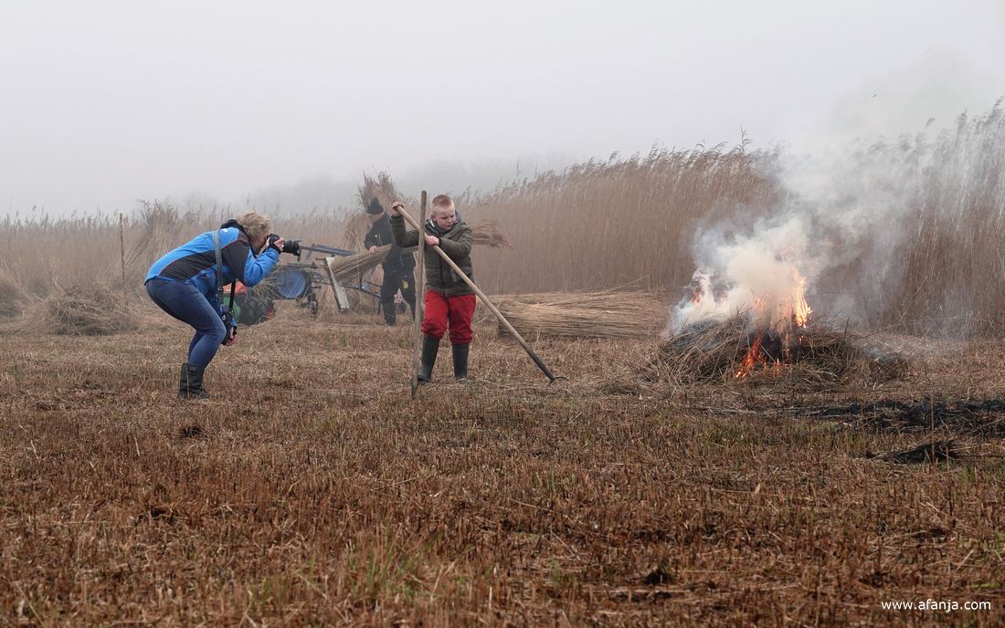 Het was een drukte van belang in het rietland die middag. In het eerste deel van deze serie vertelde ik al, dat ook vrouwen en kinderen er waren. De vrouwen vertrokken na de lunch weer, maar de kinderen bleven. Terwijl er door de rietsnijders hard werd gewerkt, hielden vooral de jongens zich bezig met vuurtje stoken. Welk kind krijgt nou de kans om dat legitiem te doen? Met het verbranden van de ruigte is menig rietsnijder zijn carrière begonnen, denk ik. Eerst kijken, en daarna het vuurtje brandend houden …