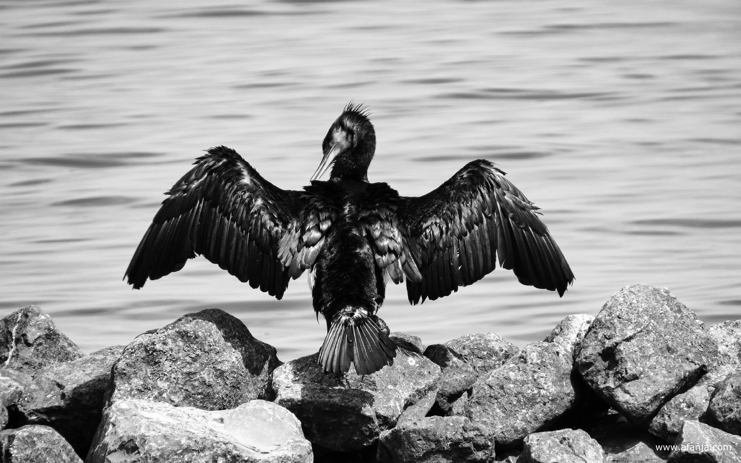 Nee, ik heb het niet over de voorjaarsschoonmaak. Die ene voorjaarsdag die ons deze week in het vooruitzicht is gesteld, kan wel beter gebruikt worden. Nee, ik heb het nu even over de aalscholver, die op een rij grote stenen langs de oever zijn veren aan het poetsen was. Voor hem is dat poetsen van levensbelang …