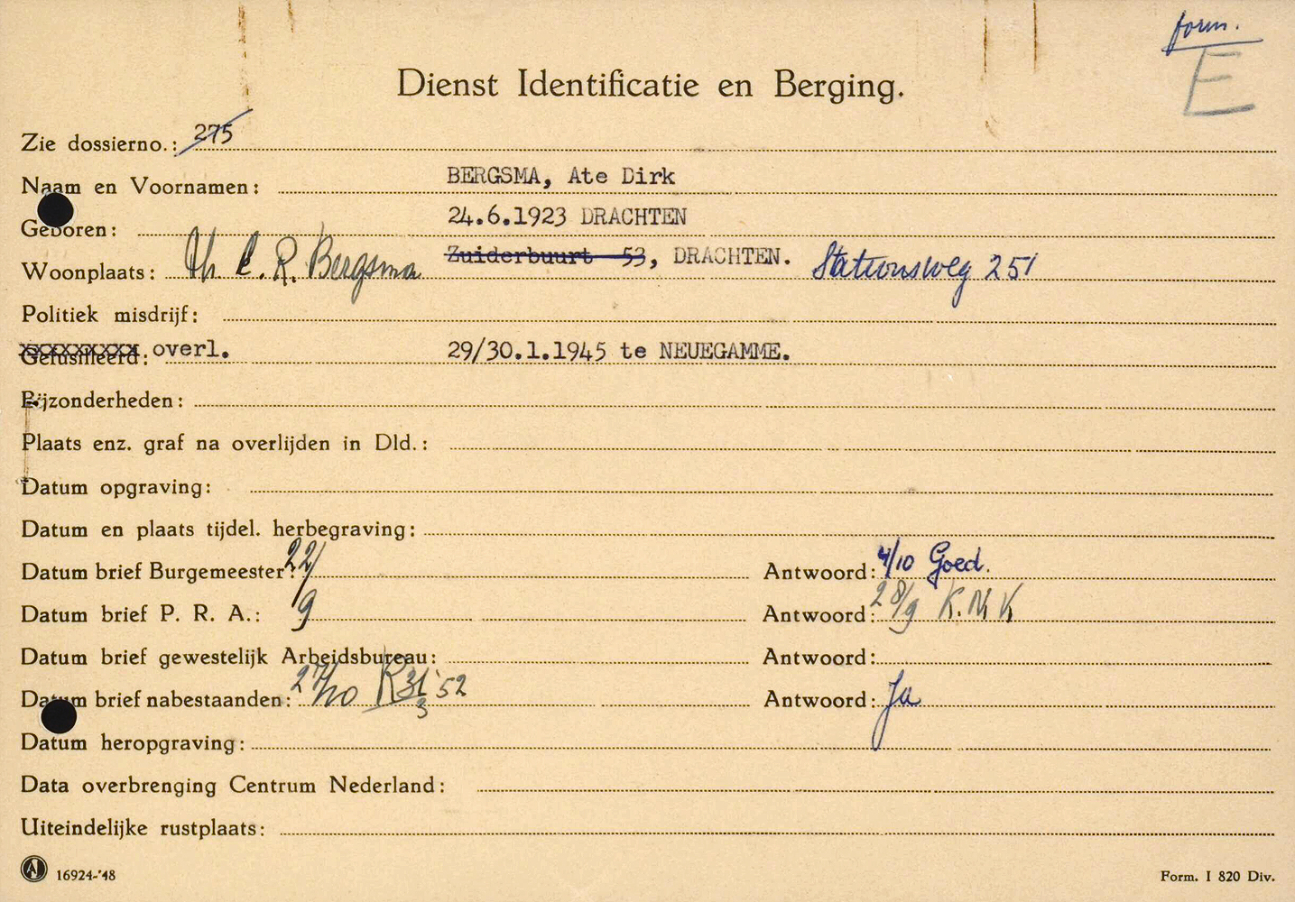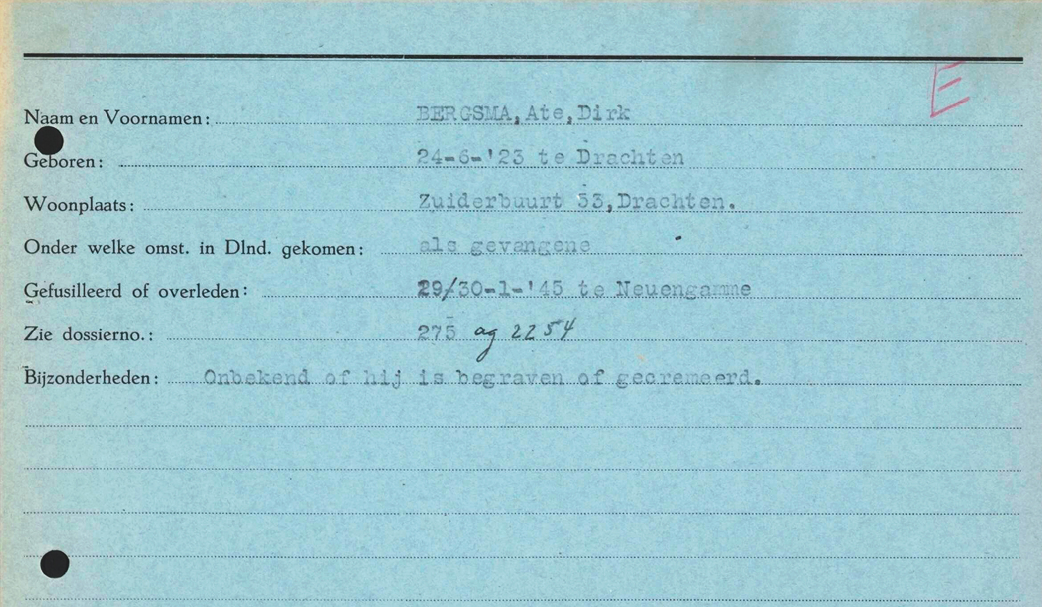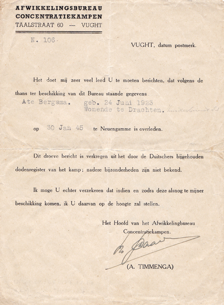 ‘Ate Dirk Bergsma, geb. 24-6-1923; zich te wenden voor de overlijdensacte Lager-Crematorium Neuengamme bij Hamburg.’ Verdere bijzonderheden ontbraken. Dit werd later bevestigd door het Ministerie van Oorlog, belast met de afwikkeling van concentratiekampen, in onderstaande brief …