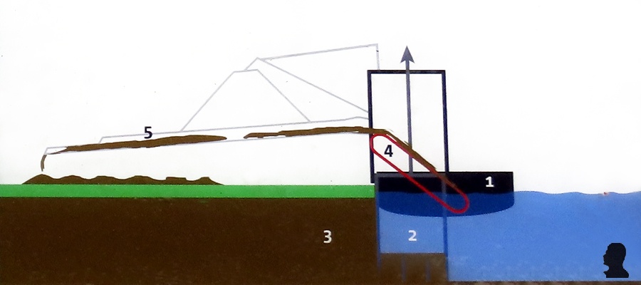 de inhoud werd in de schuit gestort en met water vermengd. Daarna kwam de veenbrij via een jacobsladder in de vloeigoot (4)
