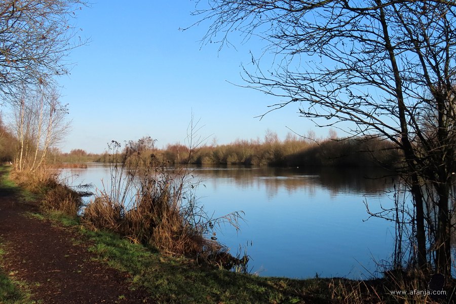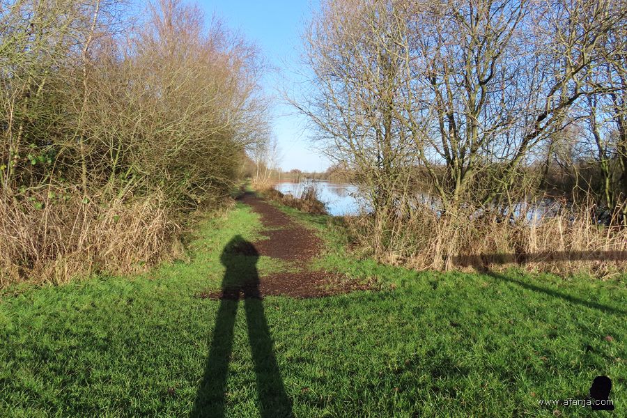 Terwijl ik langs het eerste petgat aan de wandeling begon, zag ik in de verte een grote zilverreiger op het paadje staan. Op de foto linksonder is hij slechts als een klein wit stipje te zien, op zo’n moment komt de sterke zoomlens weer goed van pas …