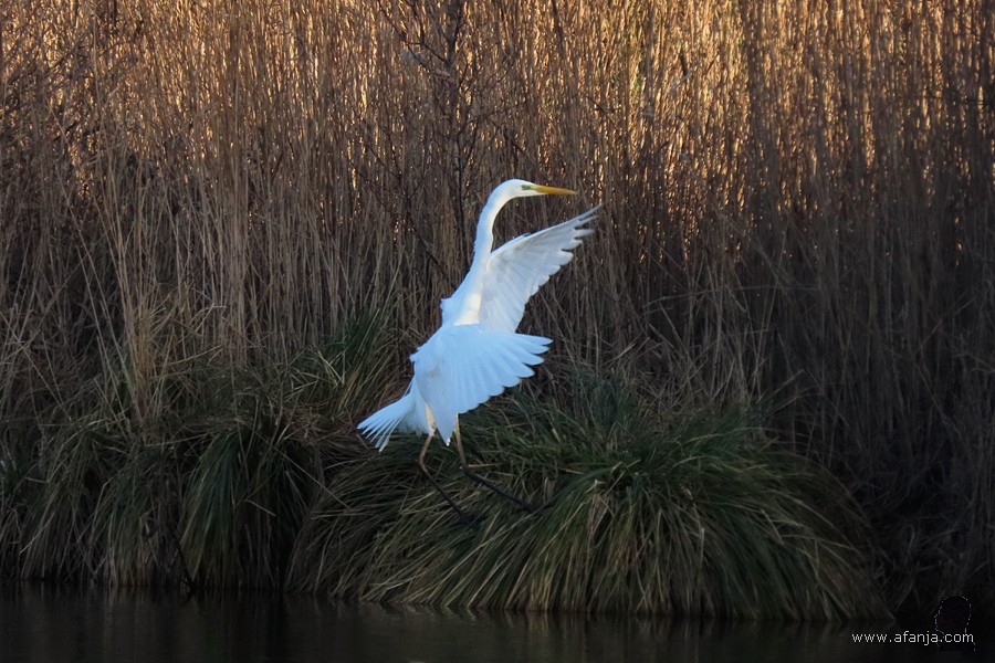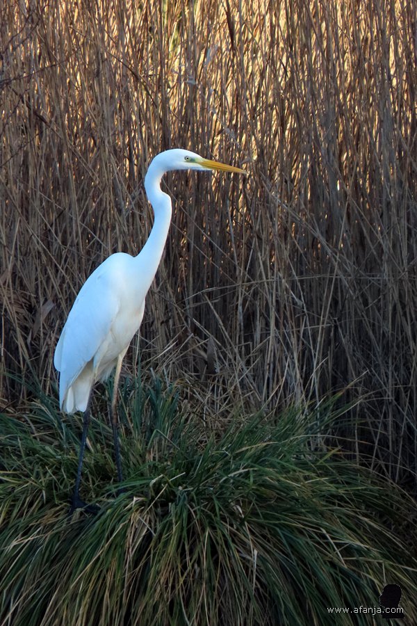 Het duurde niet lang voordat de zilverreiger mij ook zag. Hij liet me niet veel dichterbij komen en zocht al snel zijn heil aan de andere kant van het petgat. Daar ging hij op een grote pol zitten …