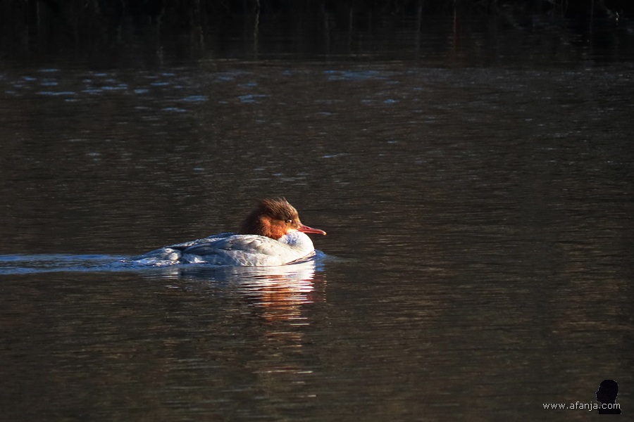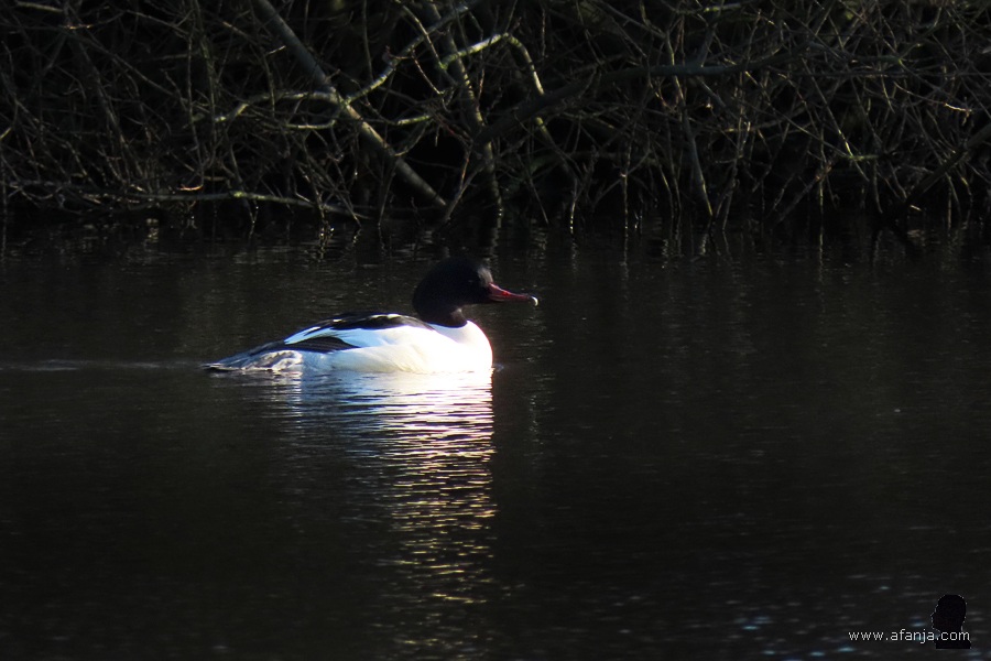 Op dat moment passeerden toevallig ook de heer en mevrouw grote zaagbek. Hij zwom voorop, maar zij maakte beter gebruik van het licht om netjes op de foto te komen …