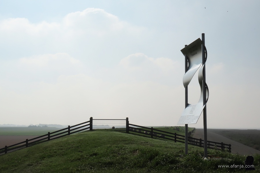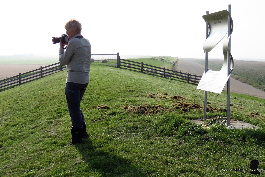 Tijd om de dijk te beklimmen, we waren tenslotte gekomen om aan de andere kant van de dijk vogels te fotograferen. Maar eerst kwamen we langs het monument ter herinnering aan de ‘Poerdersramp’ in september 1935 …