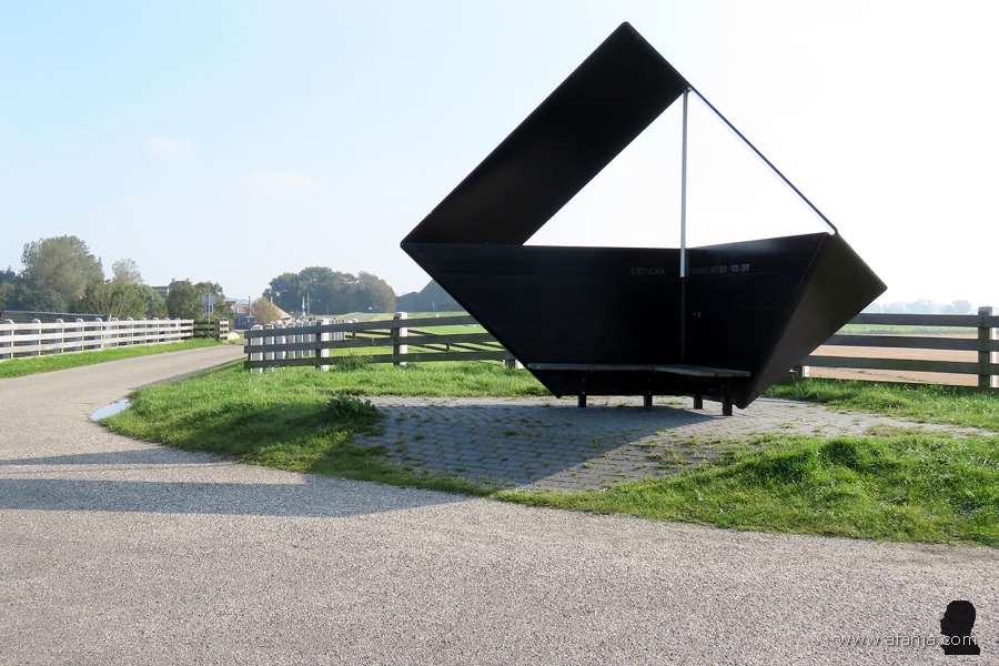 Op ons tripje door de westelijke Waddenstreek zijn we heel toepasselijk aangekomen bij Westhoek. Ik begin met een paar foto’s van een strak, deels overdekt zithoekje naast de parkeerplaats bij de kwelder (Google Maps). Het is ontworpen door Henk Rusman en geplaatst ter herinnering aan het opheffen van de gemeente Het Bildt. De naam van het kunstwerk is ‘Súdwester’. Ik vind het alleen op mijn minst raar dat Westhoek zonder W is geschreven en Het Bildt zonder t …