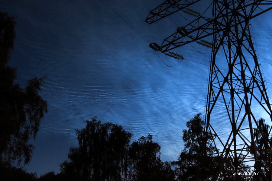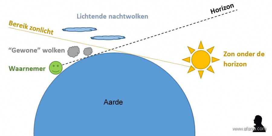 De zon schijnt van ver onder de horizon wel allerlei stofdeeltjes aan, die op een hoogte van ca. 80 km boven de aarde zweven. Aan deze stofjes, afkomstig van sterren en kometen, hechten zich onder de juiste omstandigheden kleine ijskristalletjes, die gaan schitteren in het laatste zonlicht …