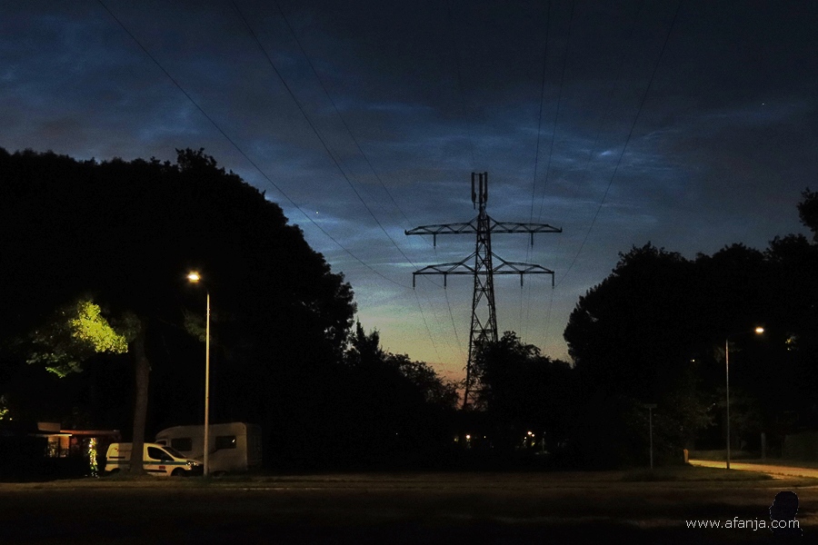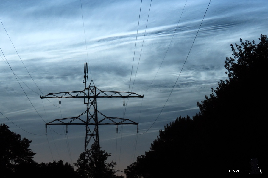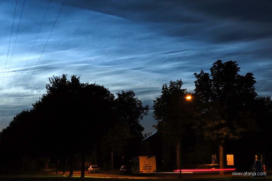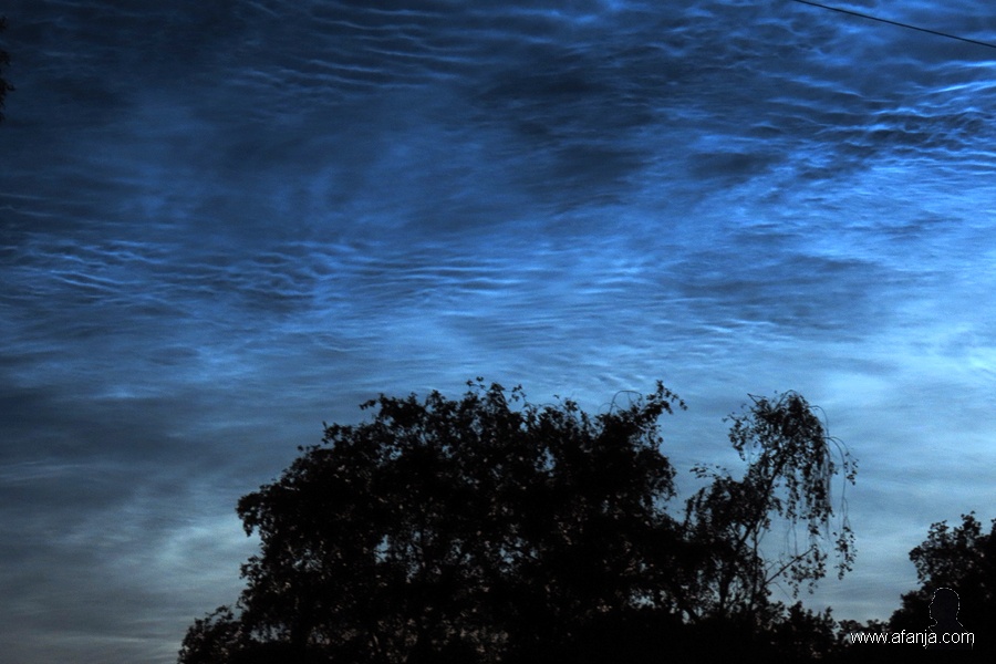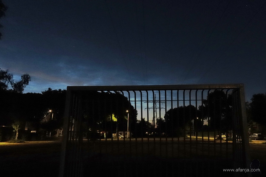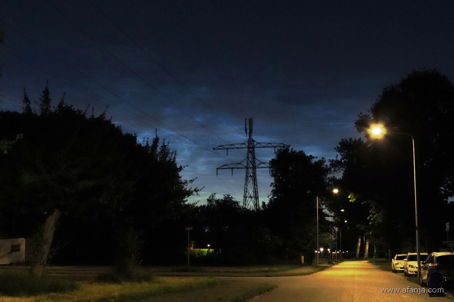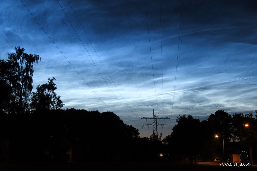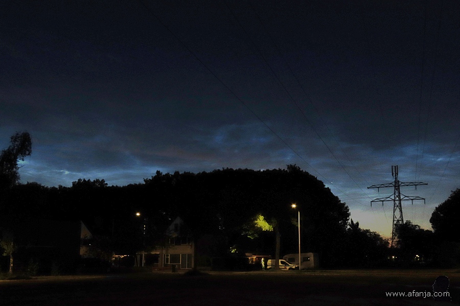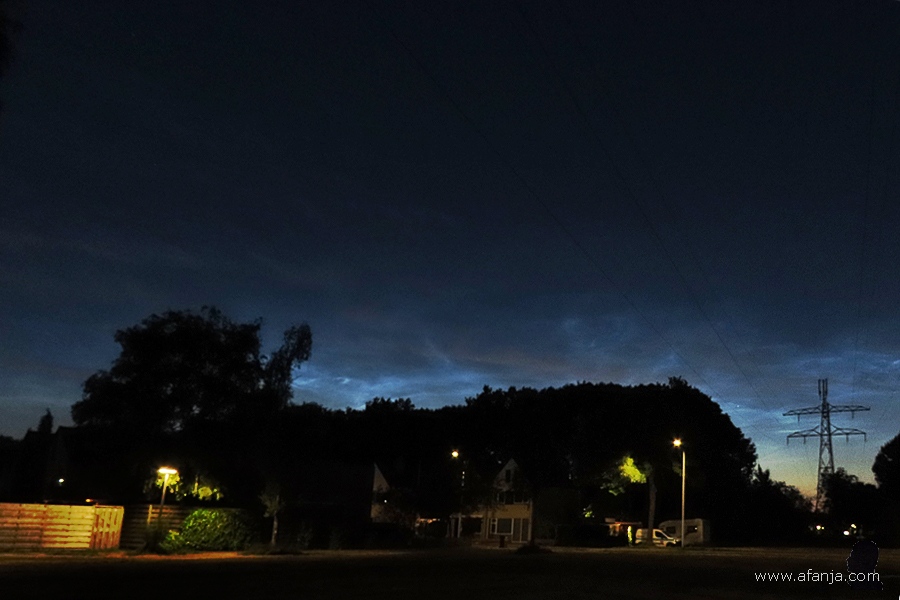 Toen ik zondag aan het eind van de avond rond 23:30 uur nog even naar buiten keek, zag ik dat de noordelijke hemel opvallend lichtblauw was. Het kon niet missen, er waren eindelijk weer eens lichtende nachtwolken te zien. Dat had ik wat eerder moeten weten, dan had ik er rekening mee kunnen houden, zodat ik nog even naar het buitengebied had kunnen rijden …