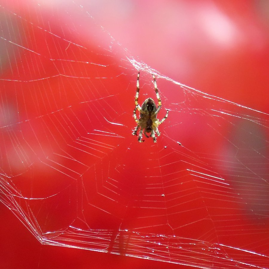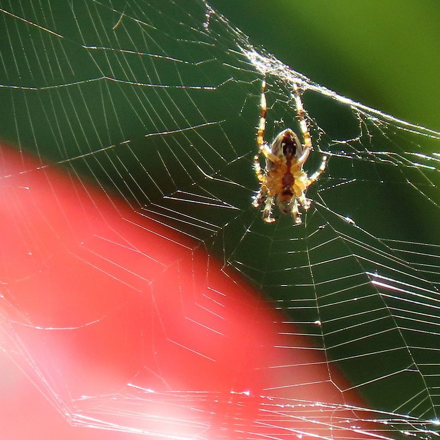 Een kruisspin hing zachtjes wiegend in de wind in zijn web, dat subtiel werd verlicht door een flets zonnetje …