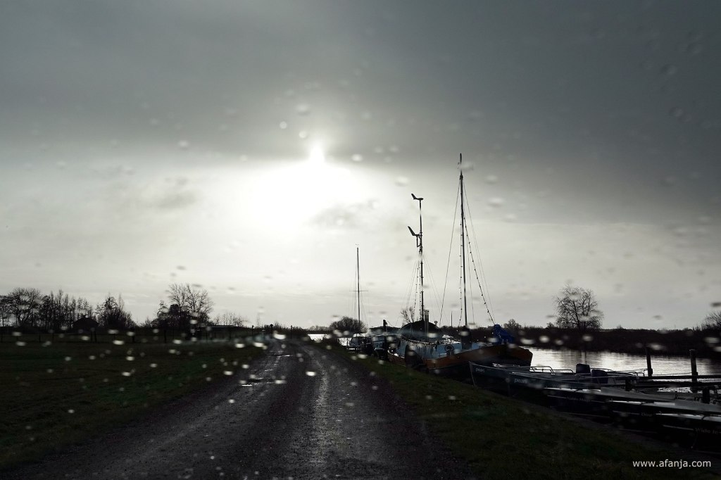 Daardoor werden de kleuren van door de felle zon belichte bomen en struiken op de oostelijke oever nog wat intenser. Intussen was de bui zo dichtbij gekomen, dat de eerste druppels kringetjes in het water begonnen te tekenen …