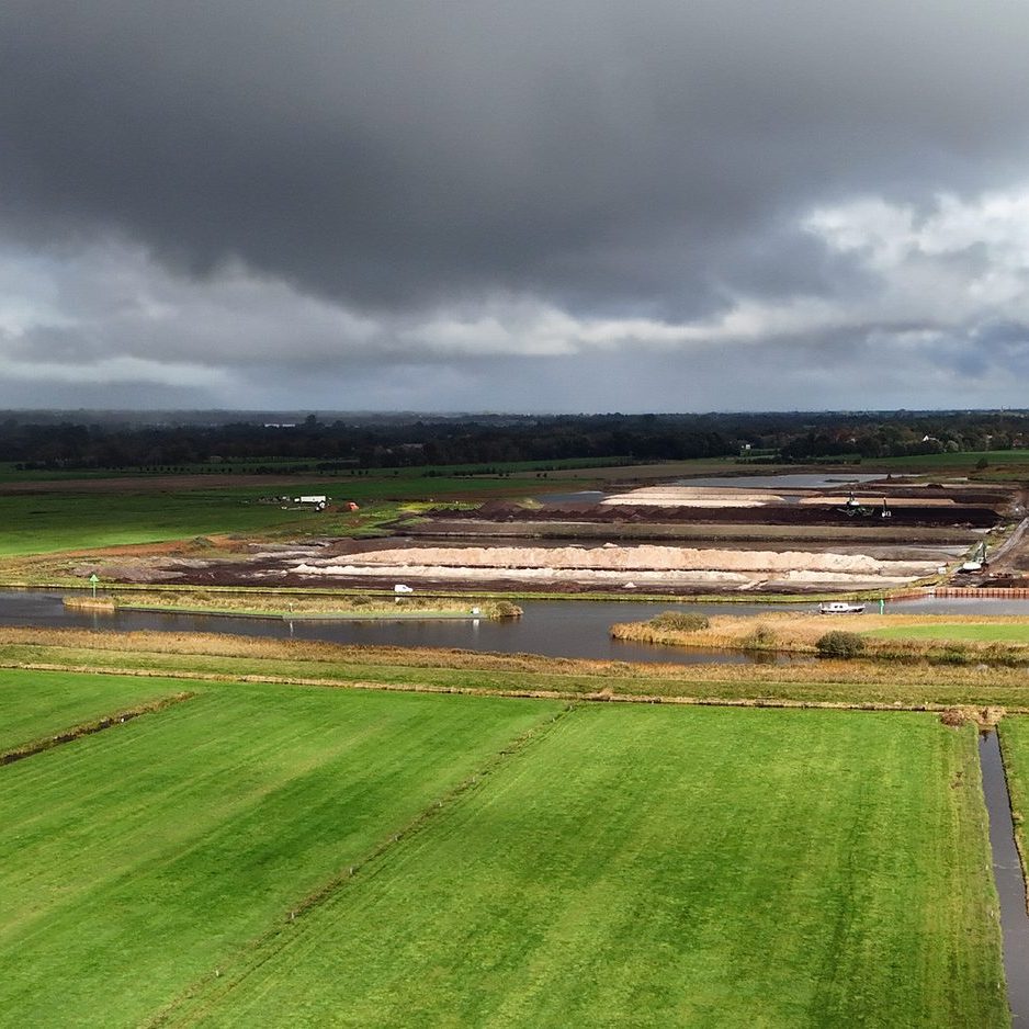 Op de vierde foto kijken we in oostelijke richting. Daar is linksboven nog net een deel van het industrieterrein bij de haven van Drachten te zien. De middelste foto hieronder laat nogmaals een beeld zien van de graafwerkzaamheden van het nieuwe meer bij Oudega. En dan is het tijd om af te dalen en terug te keren naar het punt van vertrek aan de Bûtendiken …