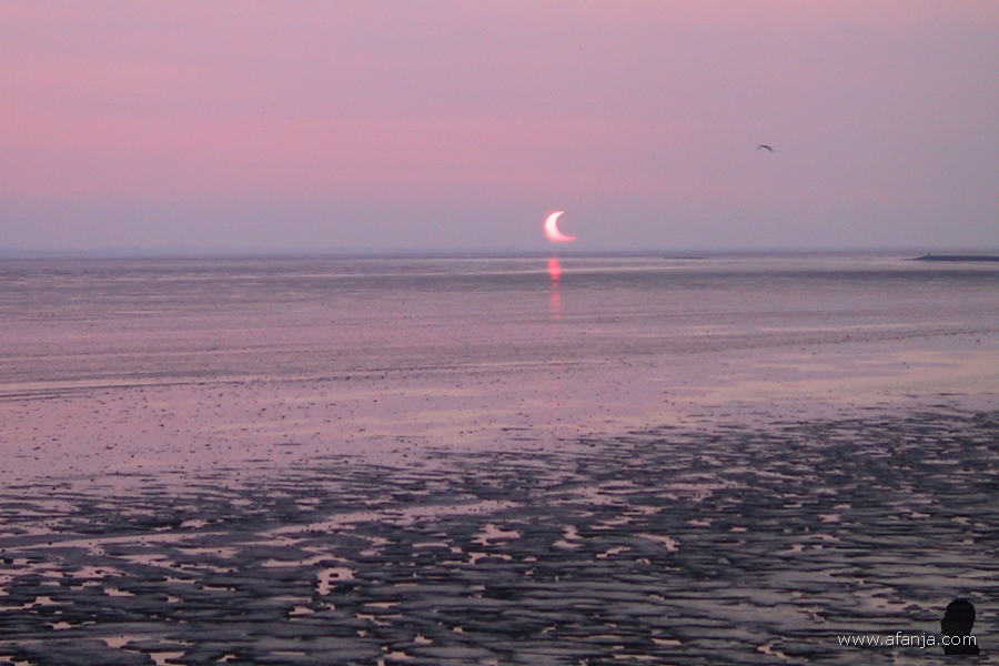 Op 31 mei 2003 was er vanuit Nederland ’s ochtends in alle vroegte een gedeeltelijk eclips te zien bij zonsopkomst. De maximale verduistering was 90%. Voor die gelegenheid ben ik midden in de nacht naar het Wad bij Paesens-Moddergat gereden. Het was sprookjesachtig mooi en ik heb er een uitgebreide fotoserie van kunnen maken (foto 2) …