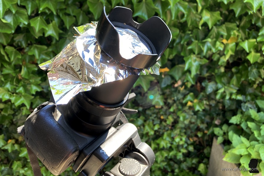 Terwijl ik vanmorgen aan de koffie zat, bedacht ik me dat ik zou kunnen proberen om het zonnefilter, dat ik ooit voor mijn oude camera had gemaakt, voorzichtig te demonteren en het dan provisorisch op mijn huidige camera te bevestigen. Veel meer dan op aluminiumfolie lijkend materiaal is zo’n zonnefilter namelijk niet. Je moet het alleen heel voorzichtig behandelen.
