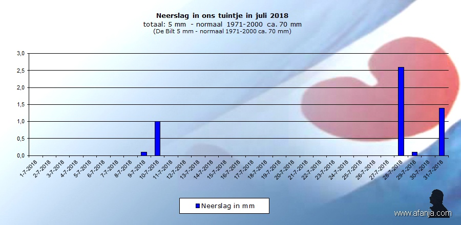 Gemiddeld viel er over het land 110 mm neerslag. Op de meeste dagen viel er in augustus wel enige regen. Er waren slechts vijf dagen die in het gehele land droog verliepen, in ons tuintje bleef het op 9 dagen helemaal droog. De meeste regen viel in het oosten van het land. Op 3 augustus viel er volgens het KNMI in Drenthe en Overijssel lokaal 50 tot 70 mm regen. Op de 18e trokken er actieve onweersbuien over het zuidoosten van het land. In Limburg viel op veel plaatsen 20 tot ruim 50 mm regen, veelal in minder dan een uur.Op een aantal plaatsen werd ruim 190 mm afgetapt. In ons tuintje is in augustus 74 mm regen gevallen, tegen een langjarig gemiddelde over 1971-2000 van ca 60 mm …
