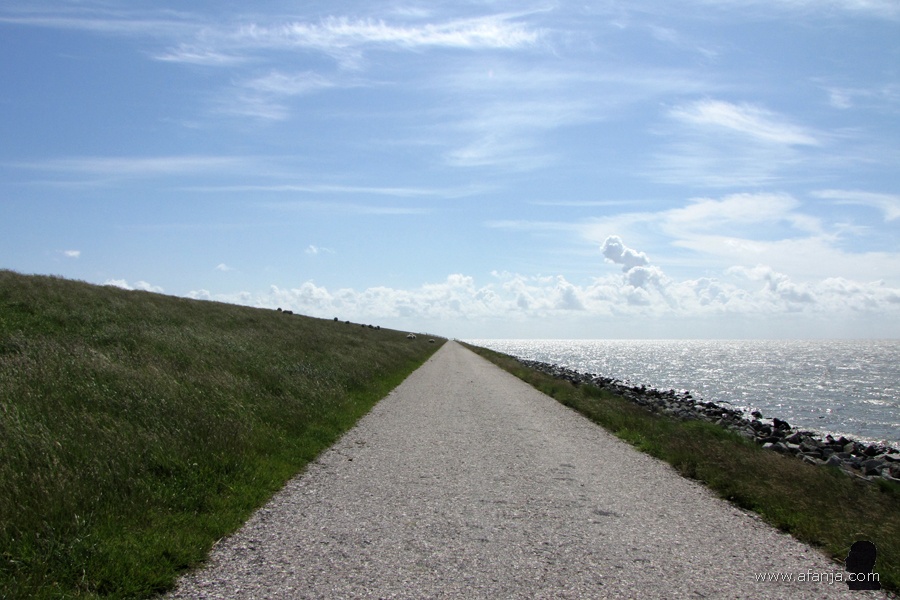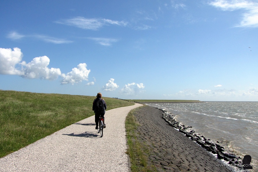 Het hek en vooral het waarschuwingsbord op de eerste twee foto’s kwamen me eerlijk gezegd dan ook wel goed uit. Even een moment van rust en humor. Volgens onze gids moesten we over de dijk, om dan aan de zeezijde verder naar het oosten te fietsen. De beide vrouwen stonden erop om alle drie de fietsen gezamenlijk naar boven te brengen, zodat ik mijn benen nog even kon ontzien. Wat een kanjers, hè …!?