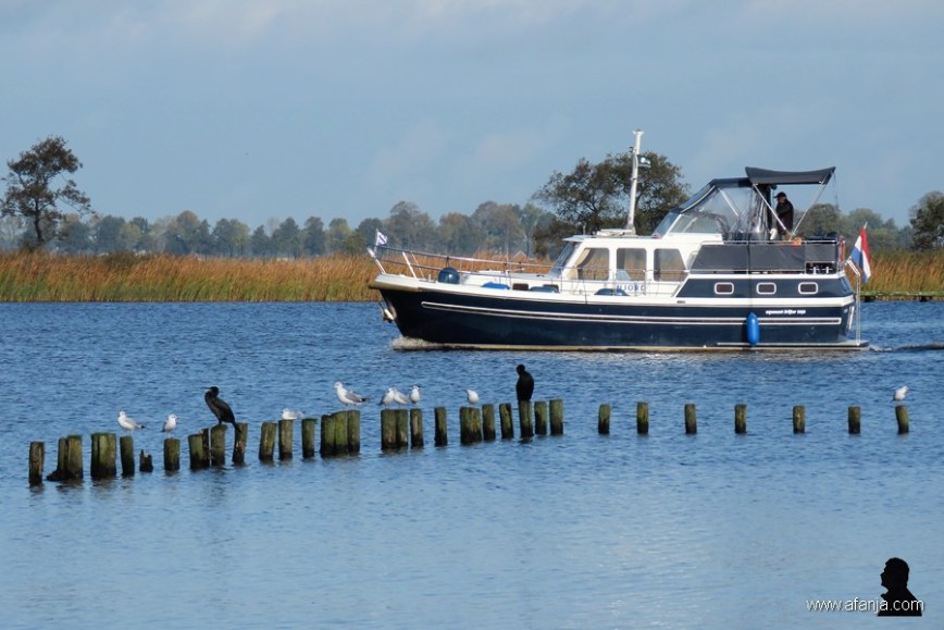 Van rechts kwam de Aquanaut Drifter 1050 ‘Njord’, een motorjacht uit Lemmer het beeld in varen op weg naar het Friese merengebied. Voor een slordige € 1.000 mag je daar een weekje mee over de Friese wateren varen. Vanaf de andere kant koerste de ‘Forza’, een 672 ton metend motorvrachtschip uit Zwijndrecht met een lengte van 57 m, in de richting van de Drachtster industriehaven …