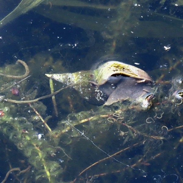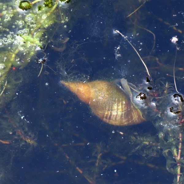 ‘De gewone poelslak, ook wel poelslak of grote poelslak (Lymnaea stagnalis) is een in het zoetwater levende slak uit de familie poelslakken. De grote poelslak leeft alleen in stilstaande wateren, zoals sloten, vijvers en vennen. Bij gevaar laat de slak zich onmiddellijk naar de bodem vallen,’ aldus Wikipedia …