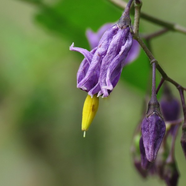 Aan de onderkant de struiken schemerden de paarsgele bloemen van het bitterzoet door het gebladerte. Het zijn mooie bloemetjes, maar aardappeltelers hebben deze plant liever niet in de buurt van een perceel met aardappelen. Bitterzoet is namelijk verantwoordelijk voor de verspreiding van bruinrot, een aardappelziekte die de oogst kan verwoesten. Hoe dan ook, de bloemetjes hingen net dichtbij genoeg om er een paar close-ups van te kunnen maken …
