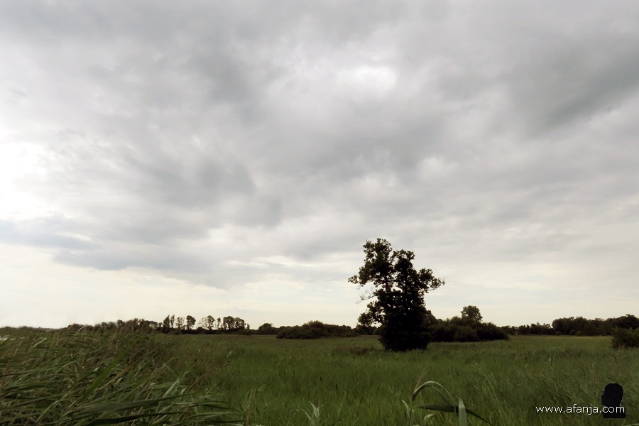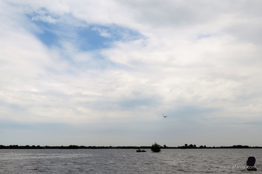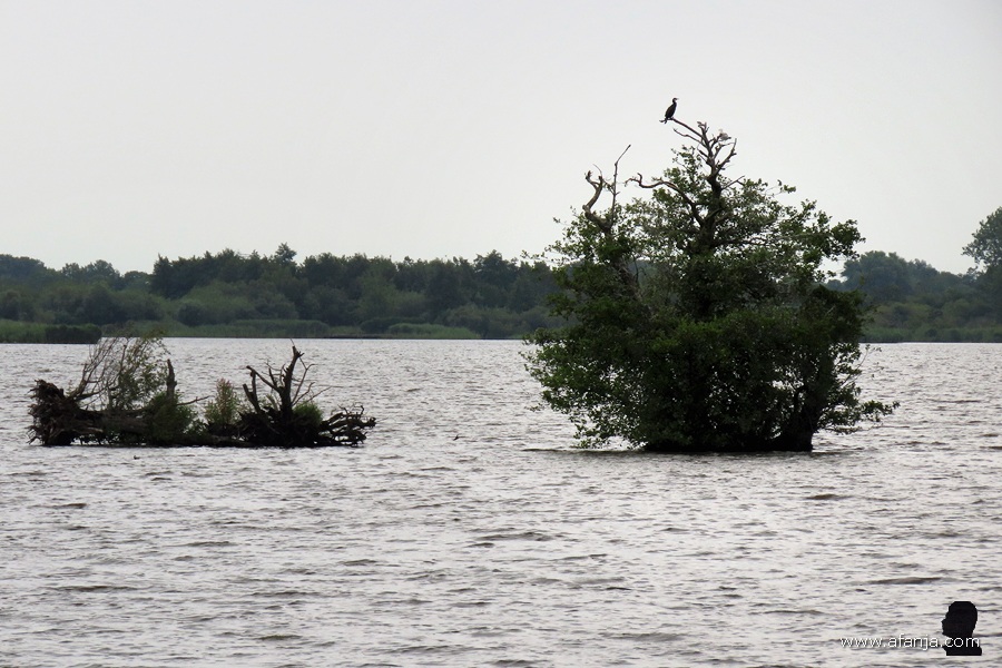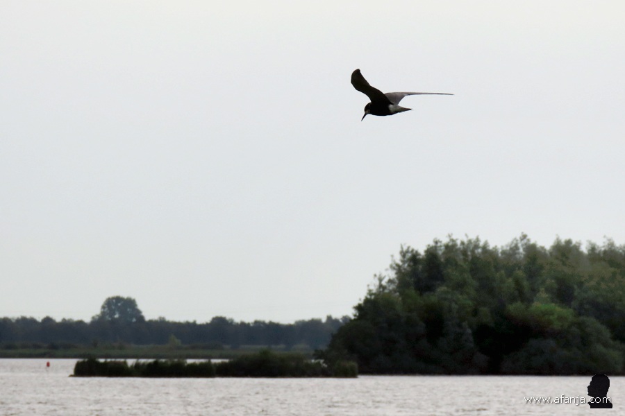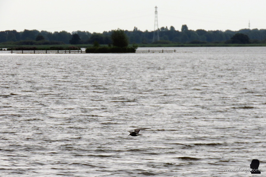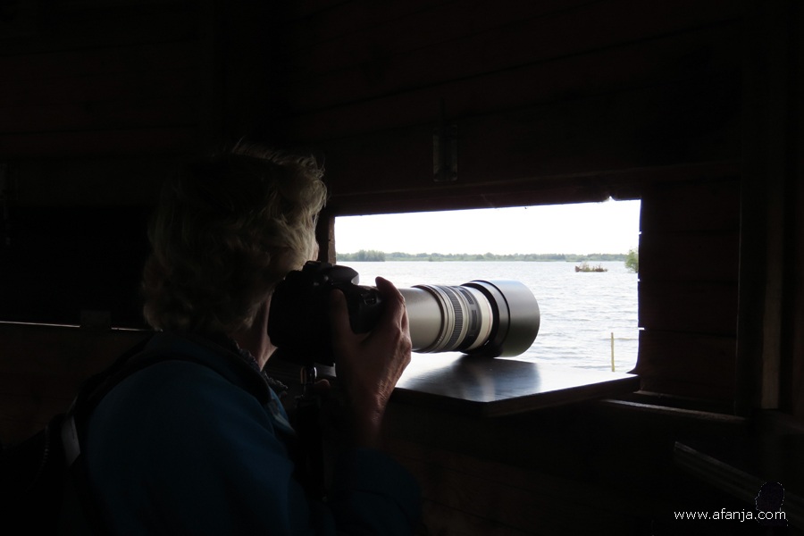 Om even wat uit te waaien, besloten we weer even een kijkje te nemen bij de vogelkijkhut ‘de Blaustirns’ bij de Leijen. Misschien hadden we ditmaal wat meer geluk dan de vorige keer, toen het vooral grijs en winderig was. Het was er opnieuw rustig, er waren alleen veel muggen of vliegjes in de lucht, die met graagte werden gevangen door laag over het water scherende zwaluwen. Zelfs op het uiteengevallen boomeilandje was verder geen vogel te zien …