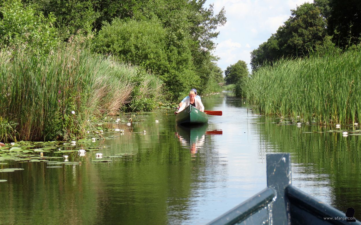 In rustig tempo tuften we de Wieden in. Nadat we een tegemoetkomende kano waren gepasseerd, doken we een stuk bos in. Daar zat o.a een jonge spreeuw in een boomtop. Eenmaal aan de andere kant van de bosschages voeren we na enige tijd onder een bruggetje door het lintdorp Dwarsgracht binnen …