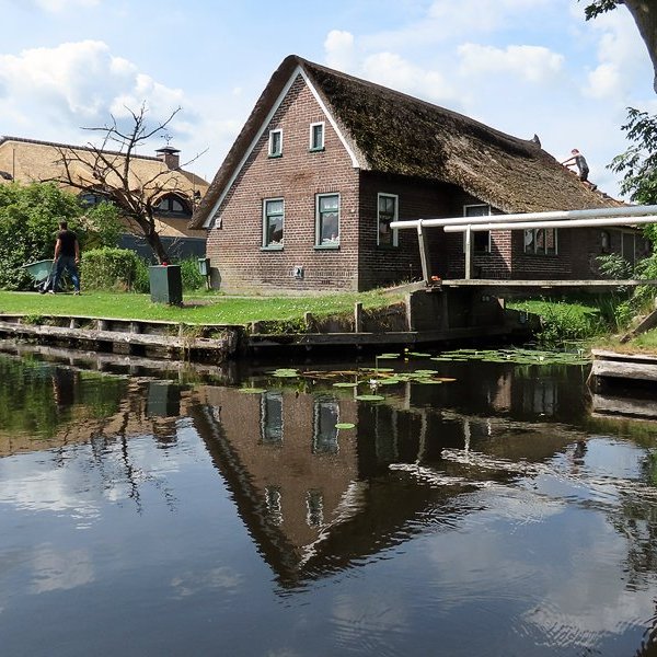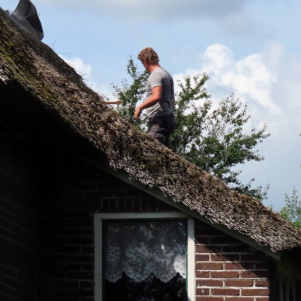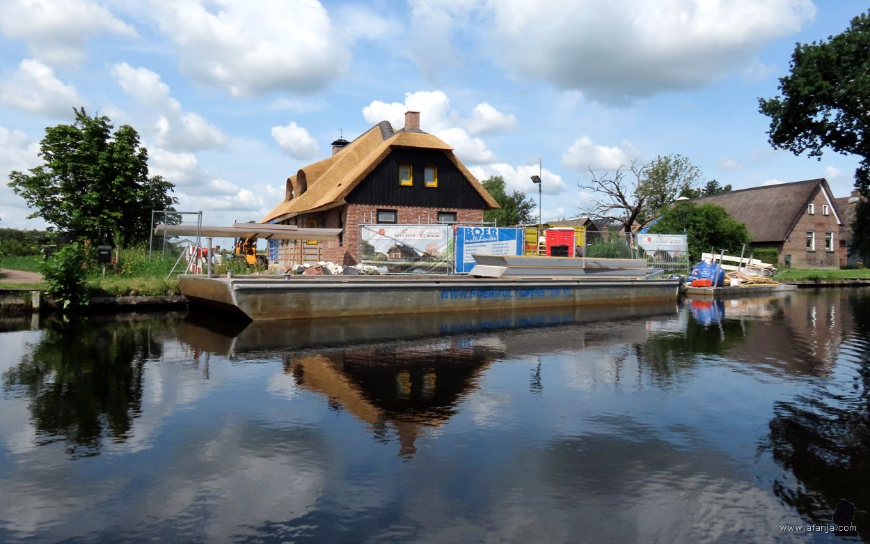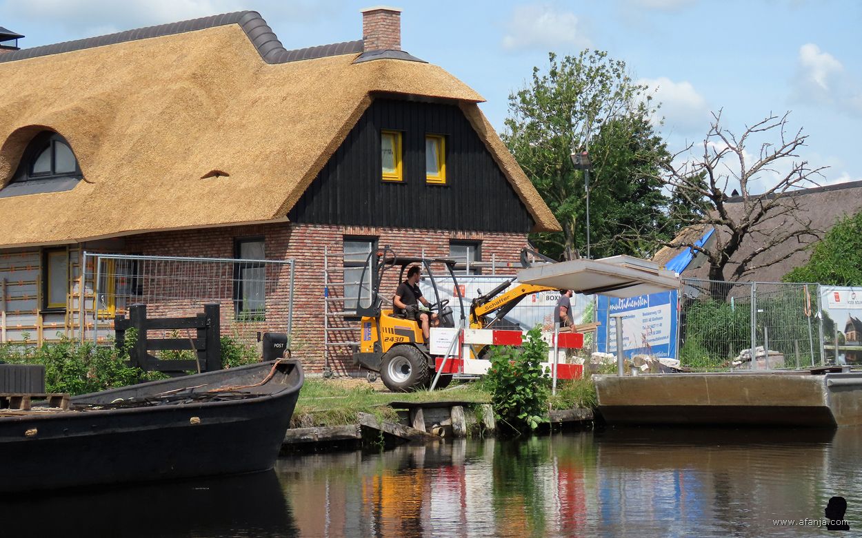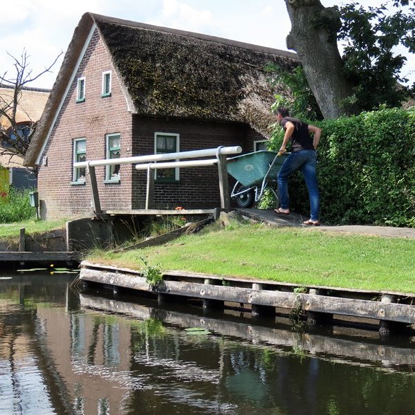 De huizen ten westen van de gracht zijn alleen lopend of per fiets bereikbaar over een smal paadje. De beste manier om boodschappen en wie weet wat nog meer thuis te brengen is met de kruiwagen. Terwijl we langs het oudste huisje van Dwarsgracht voeren, zag Jetske weer eens een bekende, in dit geval de rietdekker die bezig was op het dak van het oude huis …