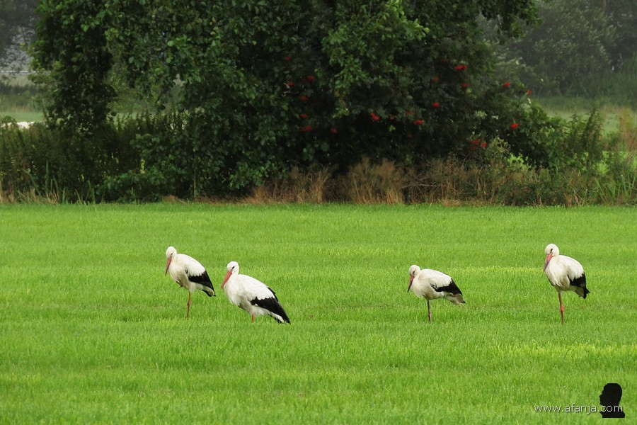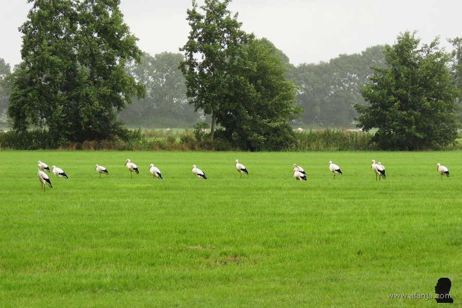 Terwijl ik maandagochtend een ritje maakte, zag ik een grote groep ooievaars in een weiland neerstrijken. Net als ik hadden ze een fikse bui zien naderen …