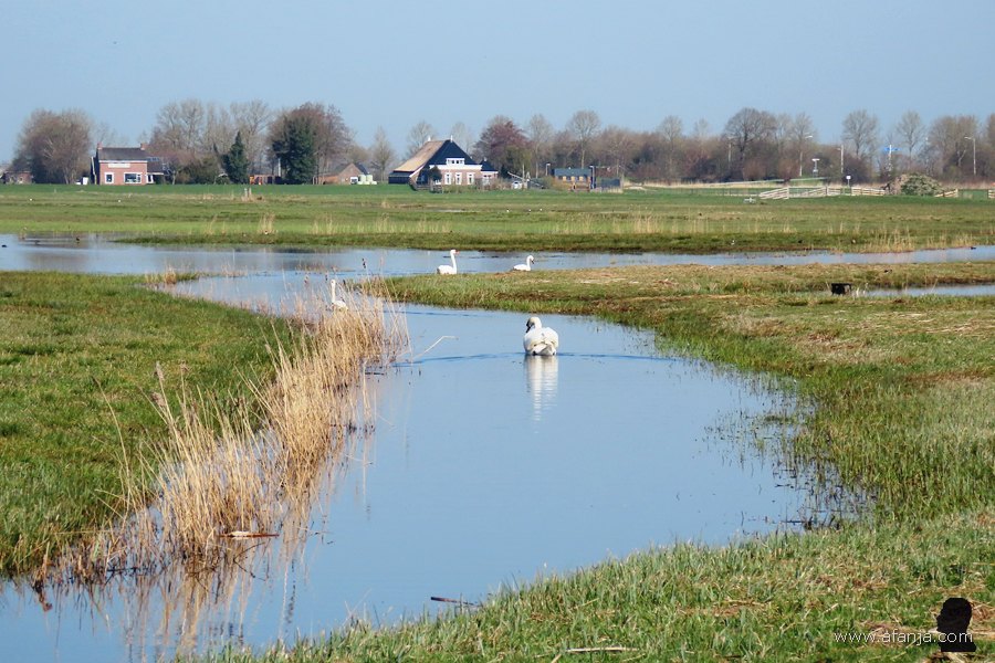 Uit de blikken op de laatste foto van de bovenstaande serie meende ik op te mogen maken, dat mijn aanwezigheid hier niet meer op prijs werd gesteld. Terwijl ik mijn camera weg legde, dobberde het amoureuze tweetal zachtjes kopjes wrijvend verder op de sloot …