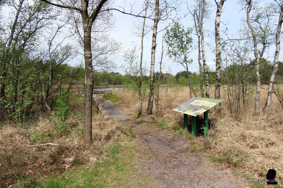 Het duurde langer dan ik had gehoopt en verwacht, voordat ik bij het bankje op de oever van een van de vennetjes aankwam. En toen ik het bankje eindelijk in zicht kreeg, bleek het helaas nog bezet te zijn ook. Toen ik op een paar meter afstand van het bankje een foto van het vennetje had genomen, zag ik wie er op het bankje zaten: het stel met het hondje.