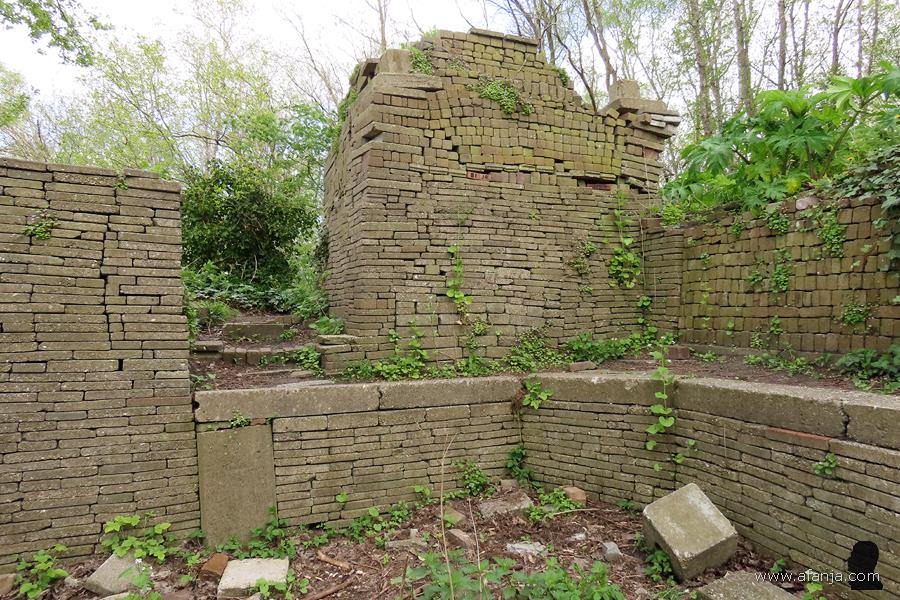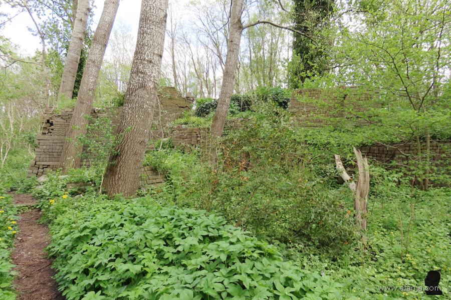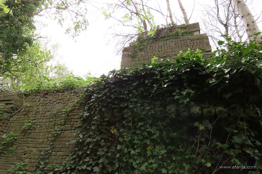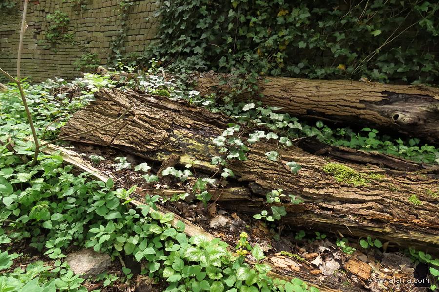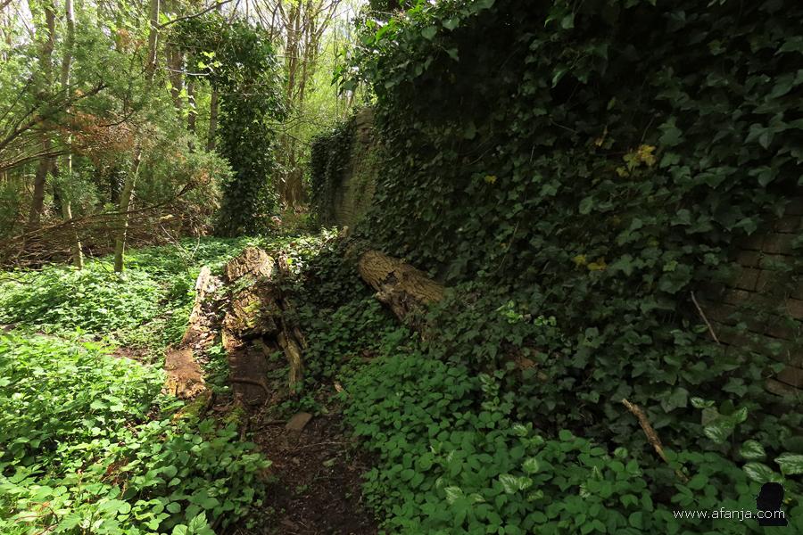 Aan het eind van de wand volg ik het paadje naar rechts. Daar sta ik aan de voet van de hoge bouwwerken aan het eind van het grondgebied van de Ecokathedraal. De wand is goeddeels bekleed met klimop en aan de voet liggen enkele deels vergane boomstammen …