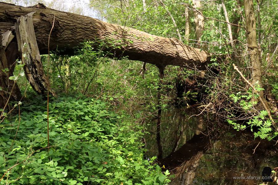 Als ik me omdraai, sta ik voor het slootje dat de Ecokathedraal begrenst. Een geïmproviseerde, waarschijnlijk clandestien aangelegde oversteekplaats leidt naar de overkant. Maar avontuurlijker geesten kunnen natuurlijk ook gebruik maken van de boombrug …