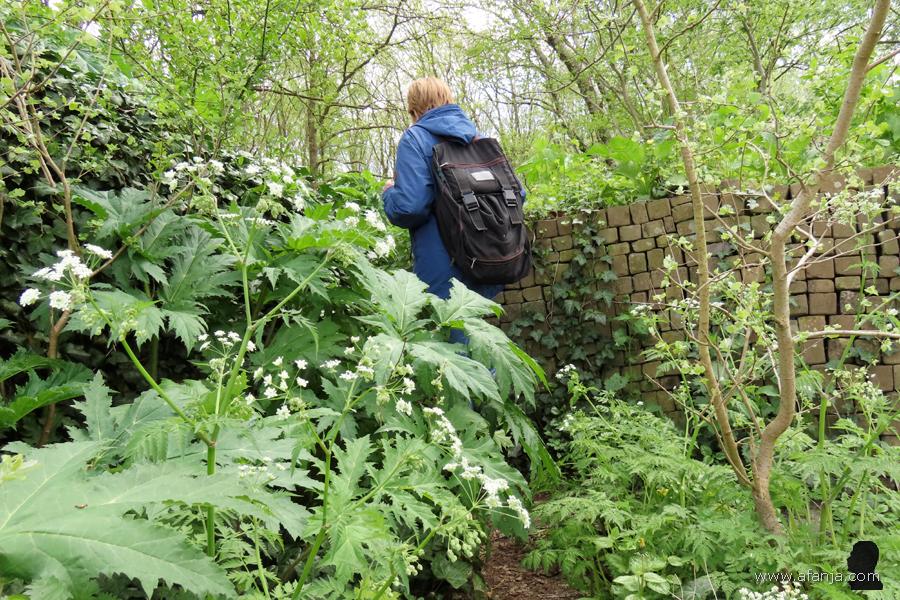 Nadat ze zich door het bos van de grote berenklauw heeft geslagen, staat Aafje op de foto hieronder naast de donjon op het hoogste punt van de Ecokathedraal. Zowel op de middelste foto hierboven als op de foto hieronder is trouwens goed te zien hoe de donjon aan de binnenzijde afbrokkelt …